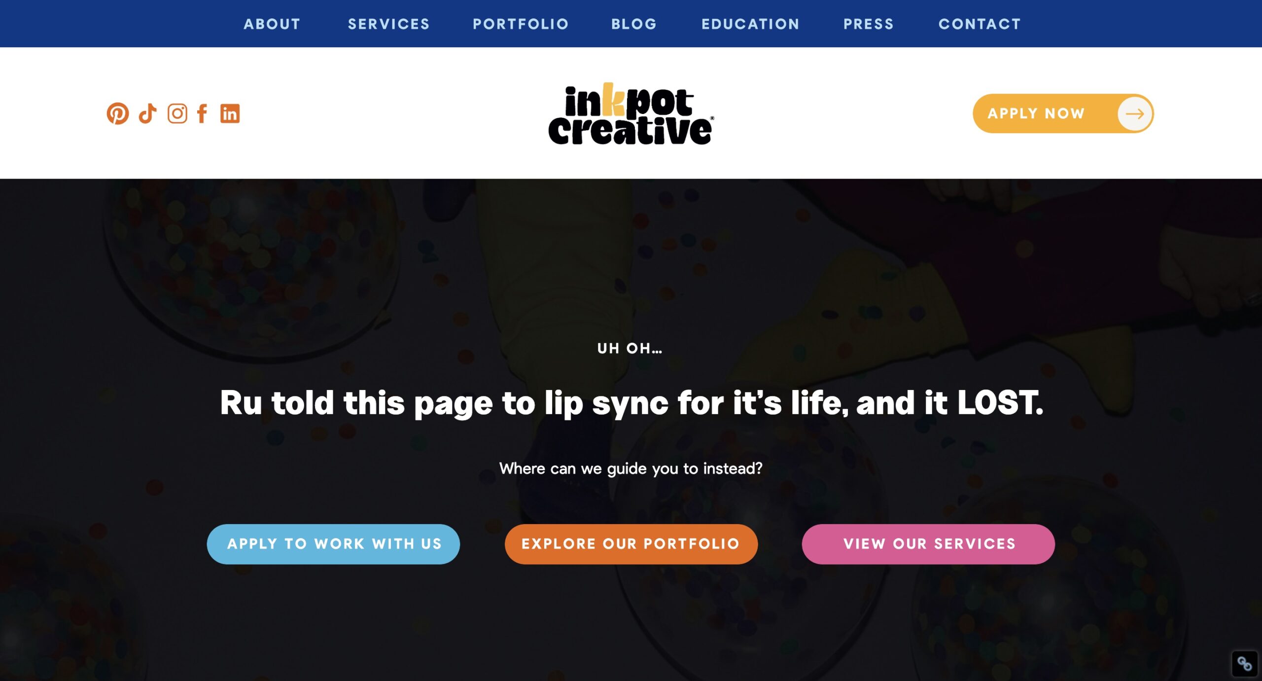 Sassy, niche, and fabulous—Inkpot Creative leans all the way into their Drag Race-loving identity. This 404 page references RuPaul in full flair and then immediately offers three strong CTAs: apply, explore, or view services. It feels like a party, not a problem.