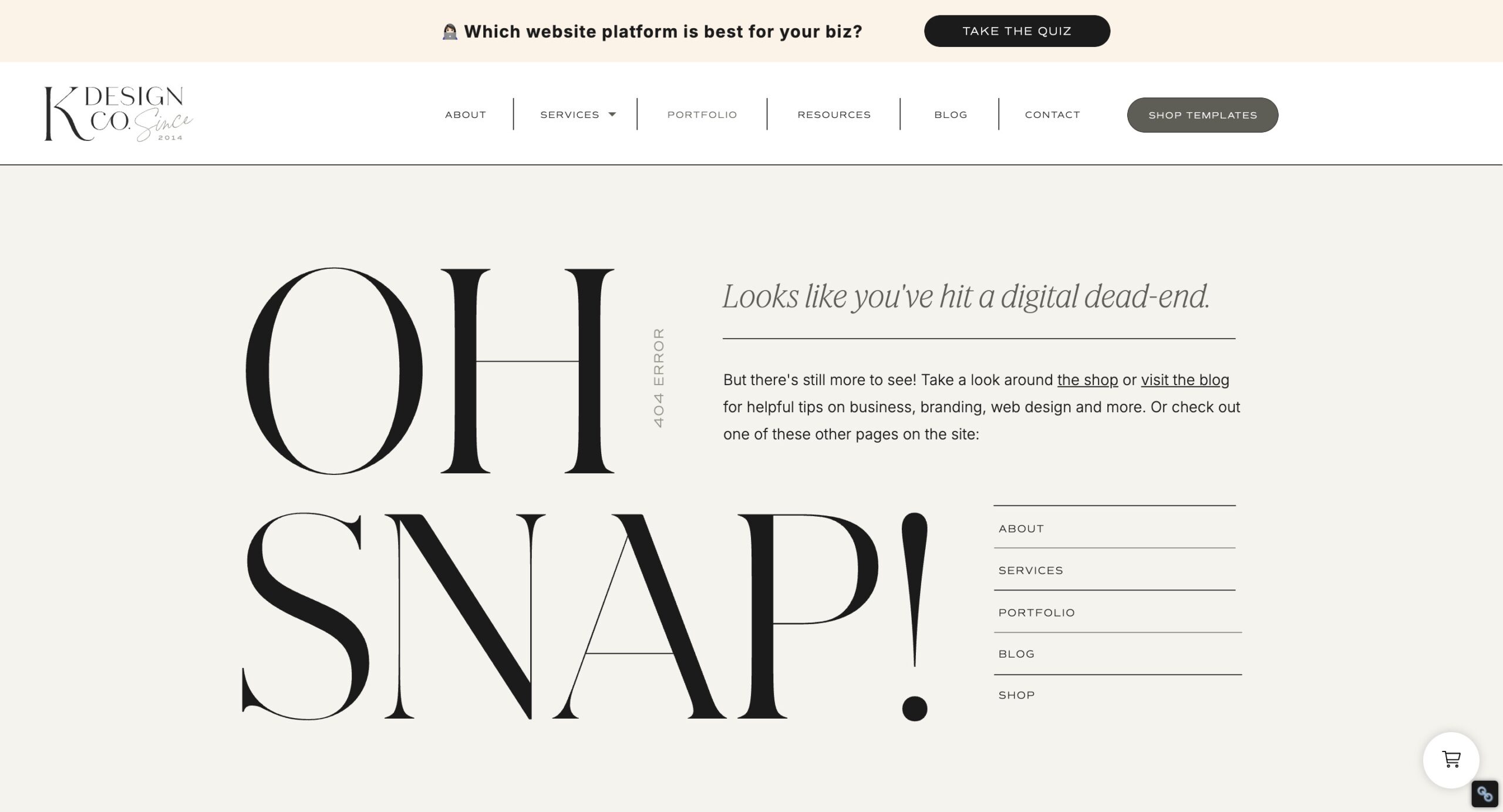 Loud, proud, and typographically dramatic, this one doesn’t whisper its error—it shouts it. “OH SNAP!” is front and center in bold, stylish serif type, owning the oops with flair. K Design Co. leans into minimal elegance with a digital-dead-end pun and clear next steps: blog, shop, or browse the menu. It’s editorial, it’s sharp, and it keeps you curious.