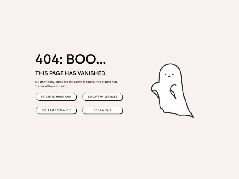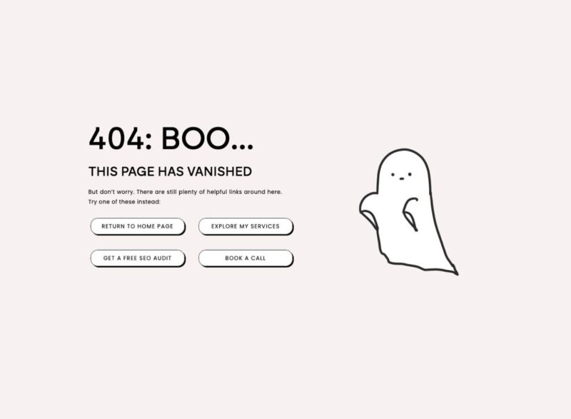 The message is simple: “This page has vanished.” But instead of leaving you haunted, it offers four friendly escape routes—Home, Services, Free SEO Audit, and Book a Call—all laid out as bold buttons that feel more like invitations than redirects. It’s helpful, cute, and unmistakably human.