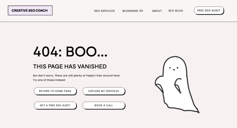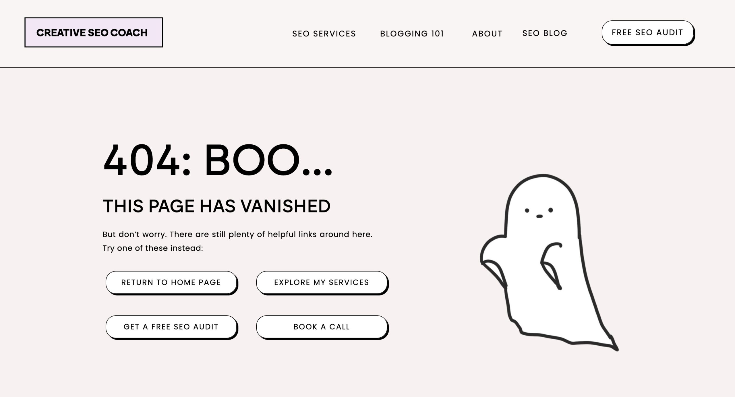 Sometimes you click a link expecting gold and get poof—nothing. Creative SEO Coach turns that moment of frustration into something lighthearted and on-brand. With a soft blush background, a lovable ghost illustration, and just the right touch of spooky sass.