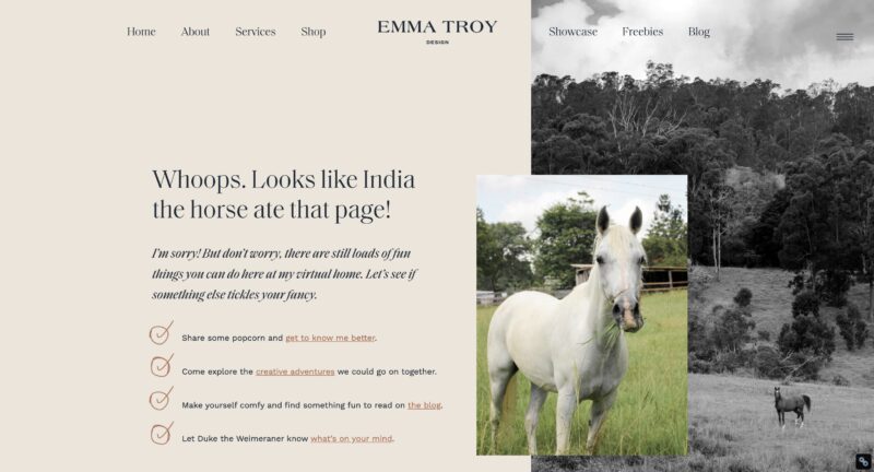 When life gives you a 404, Emma Troy gives you a horse with a side of personality. This error page is delightfully whimsical, pairing a funny, personalized message with a charming photo of India mid-snack. Add a few quirky suggestions (share popcorn, meet Duke the Weimaraner, explore adventures), and it turns a broken link into a branded micro-moment of joy. It feels like you stumbled into a lifestyle blog—not an error.