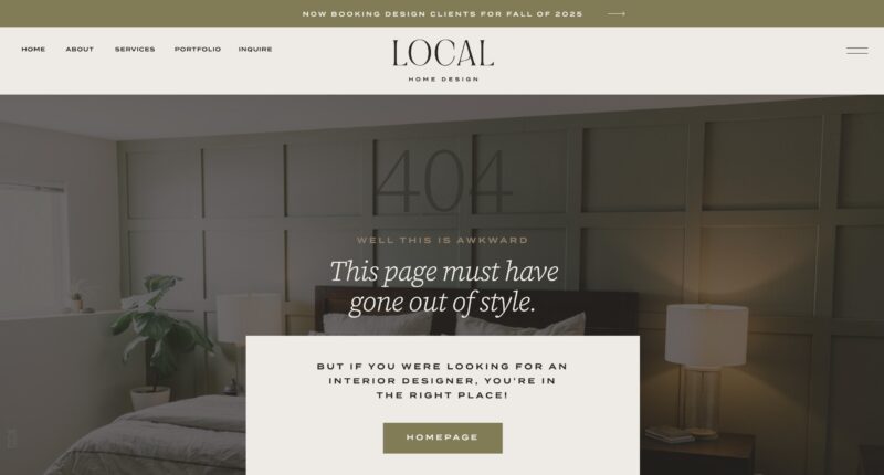 Simple, stylish, and self-aware—Local Home Design handles its 404 with the same polish you’d expect from a well-curated living room. With the soft message “Well this is awkward… this page must have gone out of style,” it leans into the interior design theme while keeping things light and approachable.