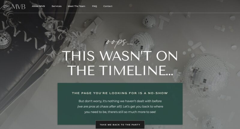 MVB handles this 404 like any seasoned event pro would—with grace, sparkle, and a touch of humor. Against a backdrop of confetti and disco balls, the message reads: “Oops… this wasn’t on the timeline.” It’s the perfect metaphor for a missing page on an event planner’s site. The follow-up copy reassures you that chaos is their specialty and that everything’s still under control.