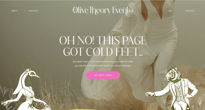 When your entire brand revolves around weddings, even your 404 page can’t escape the drama of a runaway bride moment. Olive Theory Event Co. leans all the way into the metaphor with the line: “This page got cold feet…” A blurred, cinematic image of a bride mid-sprint sets the tone, while playful animal characters in formalwear flank the design. The vibe? Whimsical, romantic, and very on theme.