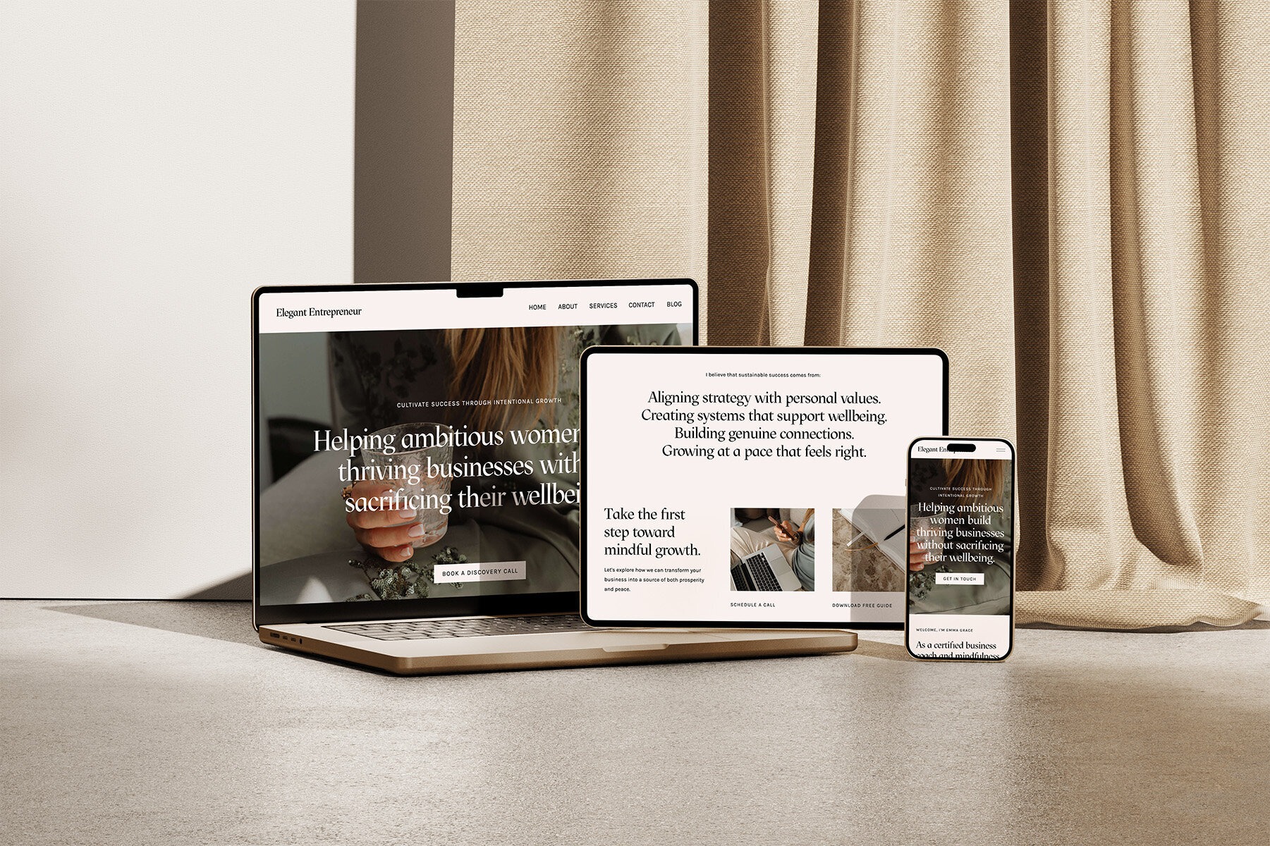 Elegant Entrepreneur Showit template displayed on a laptop, tablet, and smartphone screen, showcasing a minimalist, wellness-focused design with soft neutral tones and intentional messaging for female entrepreneurs and coaches.