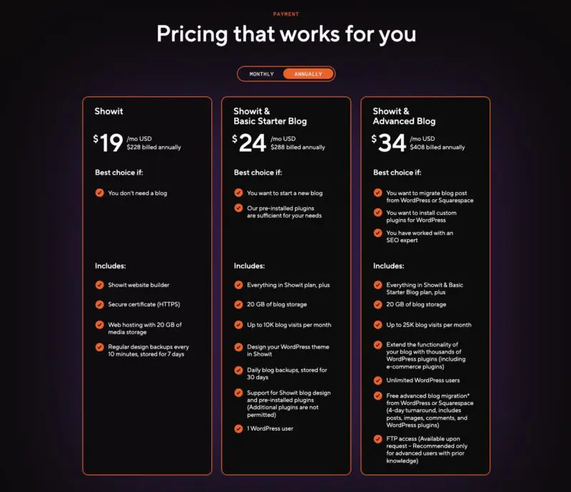 Showit offers a few different plans depending on your needs, and the biggest difference comes down to whether or not you want to blog.