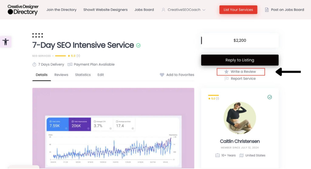 3. Click on “Write a Review”: On the service listing page, find and click the “Write a Review” button.