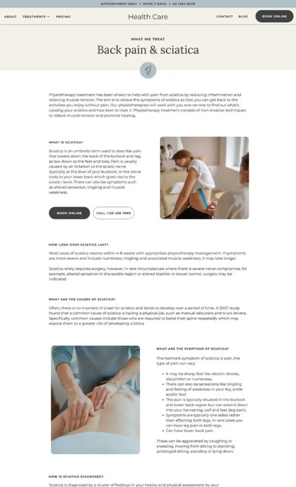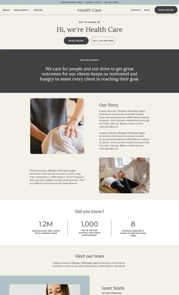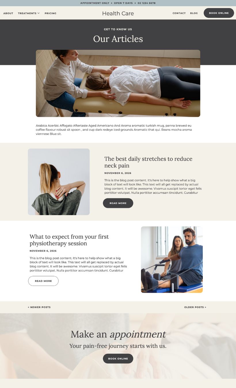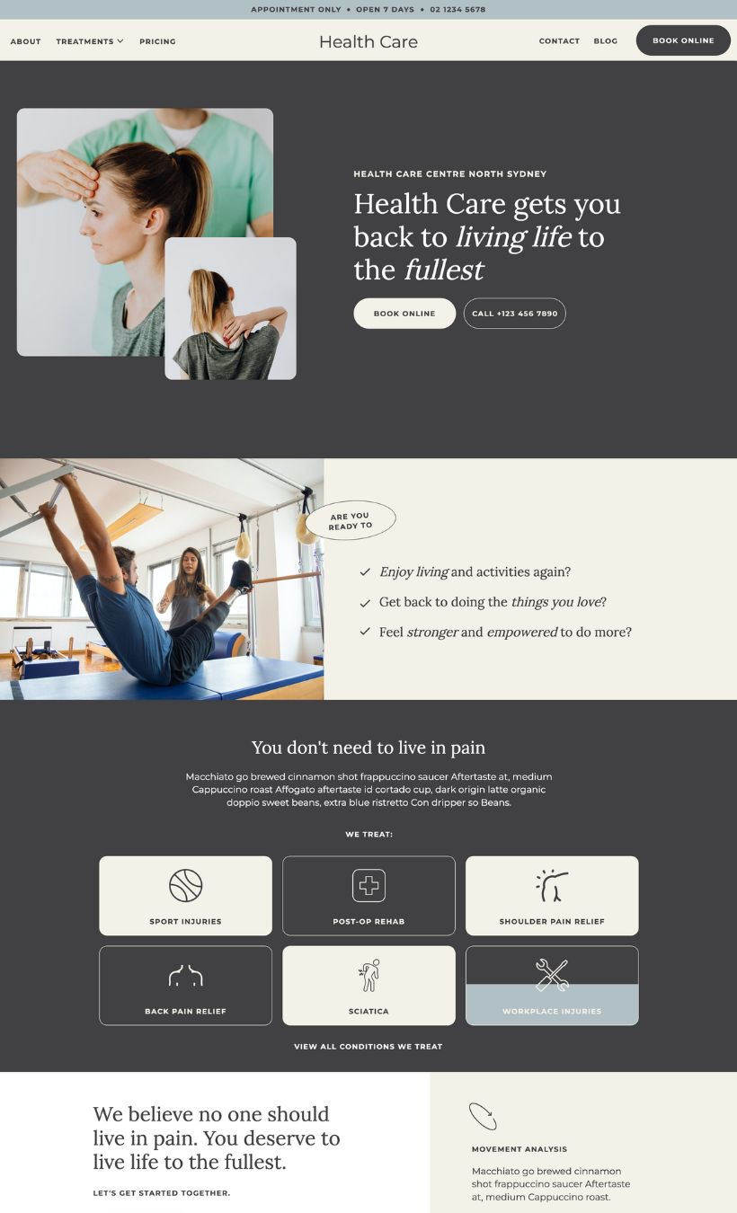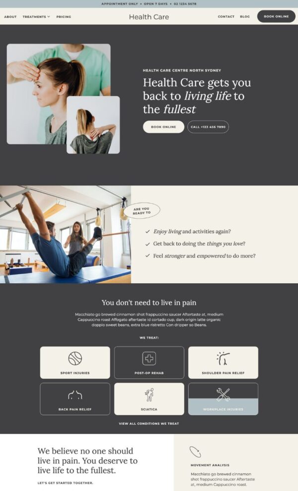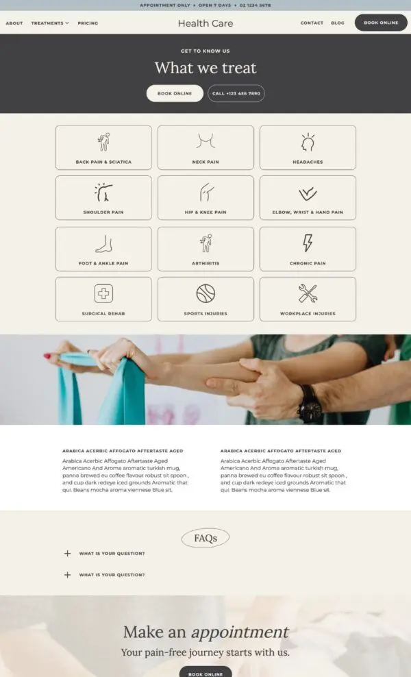 With a clean, modern design, seamless navigation, and built-in features like treatment overviews, team bios, testimonials, and blog integration, your website will instantly build trust and engage visitors. Whether you offer pain relief, rehabilitation, or wellness services, this template makes it easy to communicate your value and grow your business.