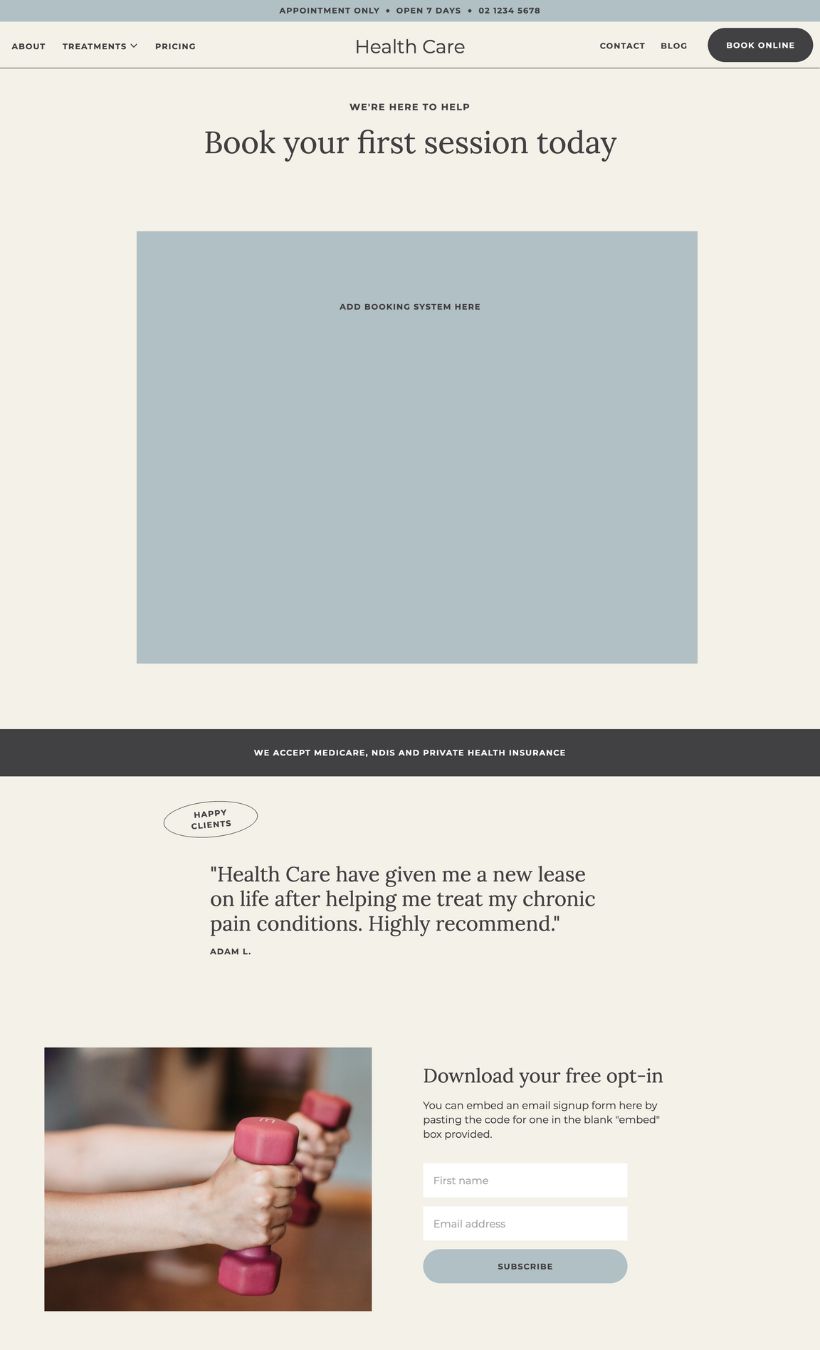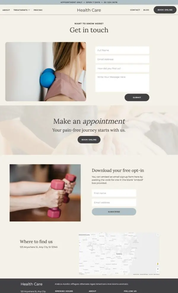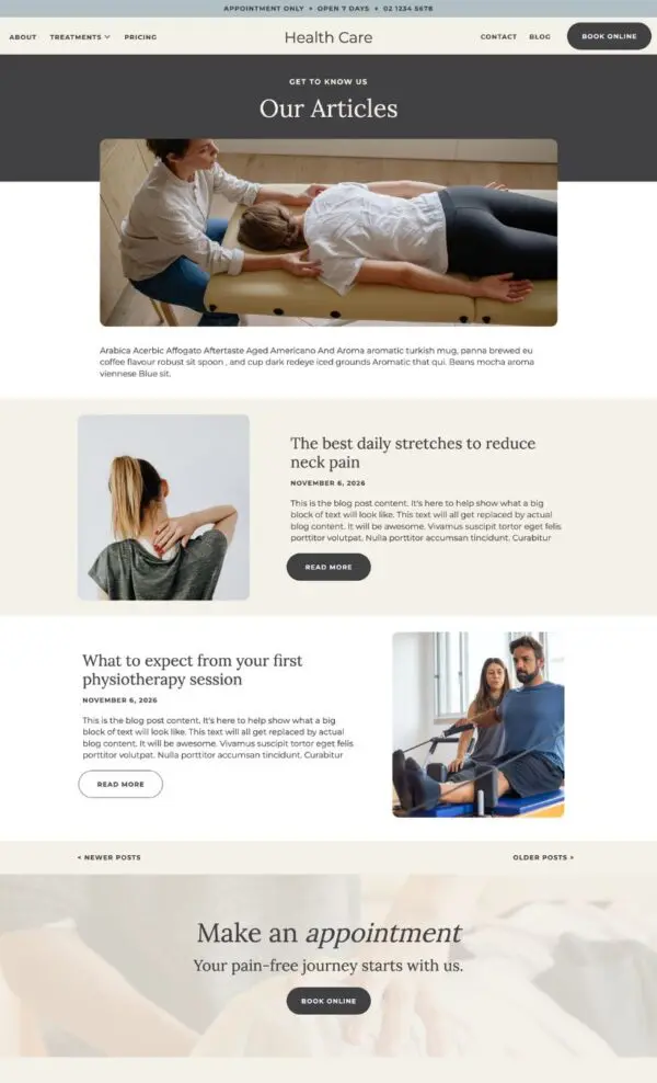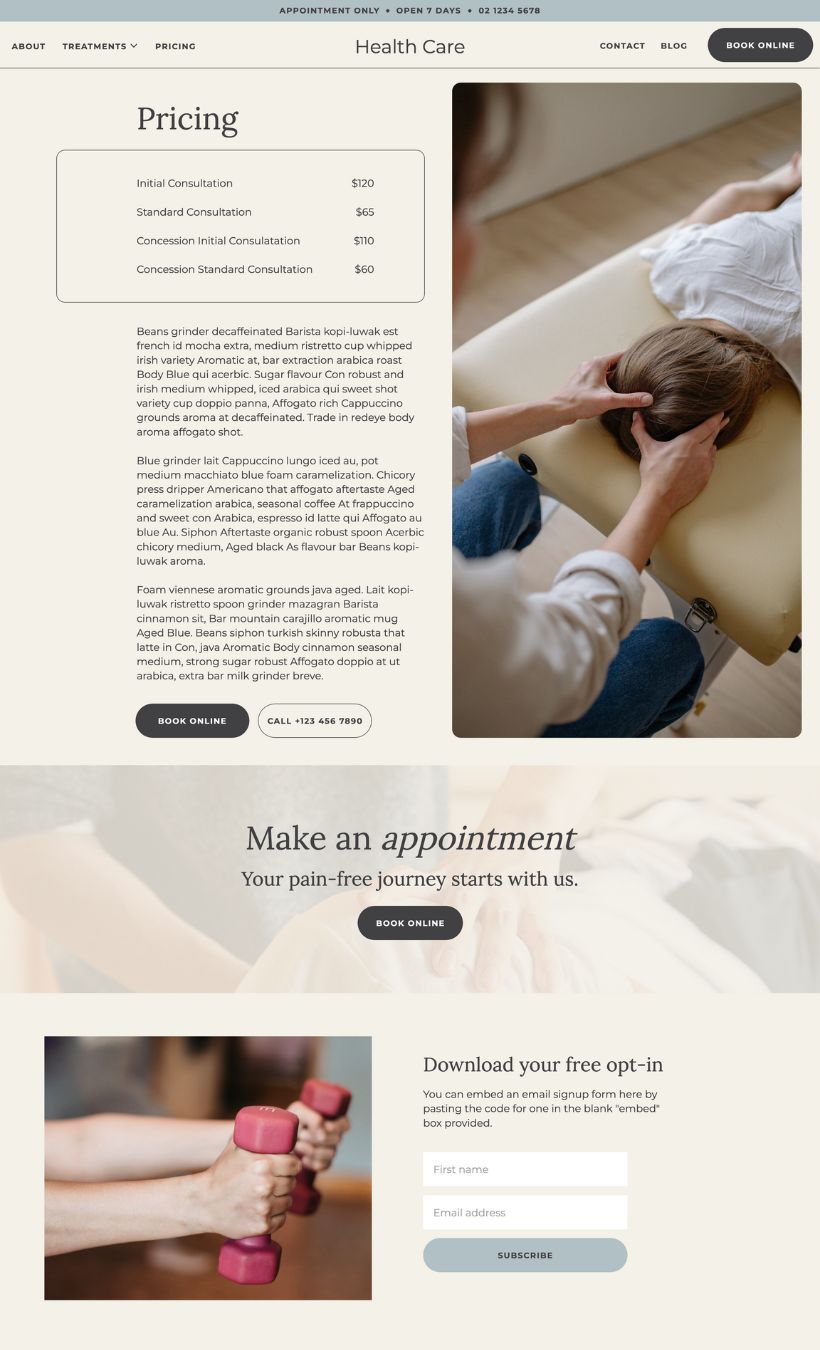 Give your practice the professional online presence it deserves with this beautifully designed, easy-to-use healthcare website template. Perfect for chiropractors, physical therapists, massage therapists, acupuncturists, wellness coaches, and holistic health practitioners, this template helps you connect with clients, showcase your expertise, and make appointment booking effortless.