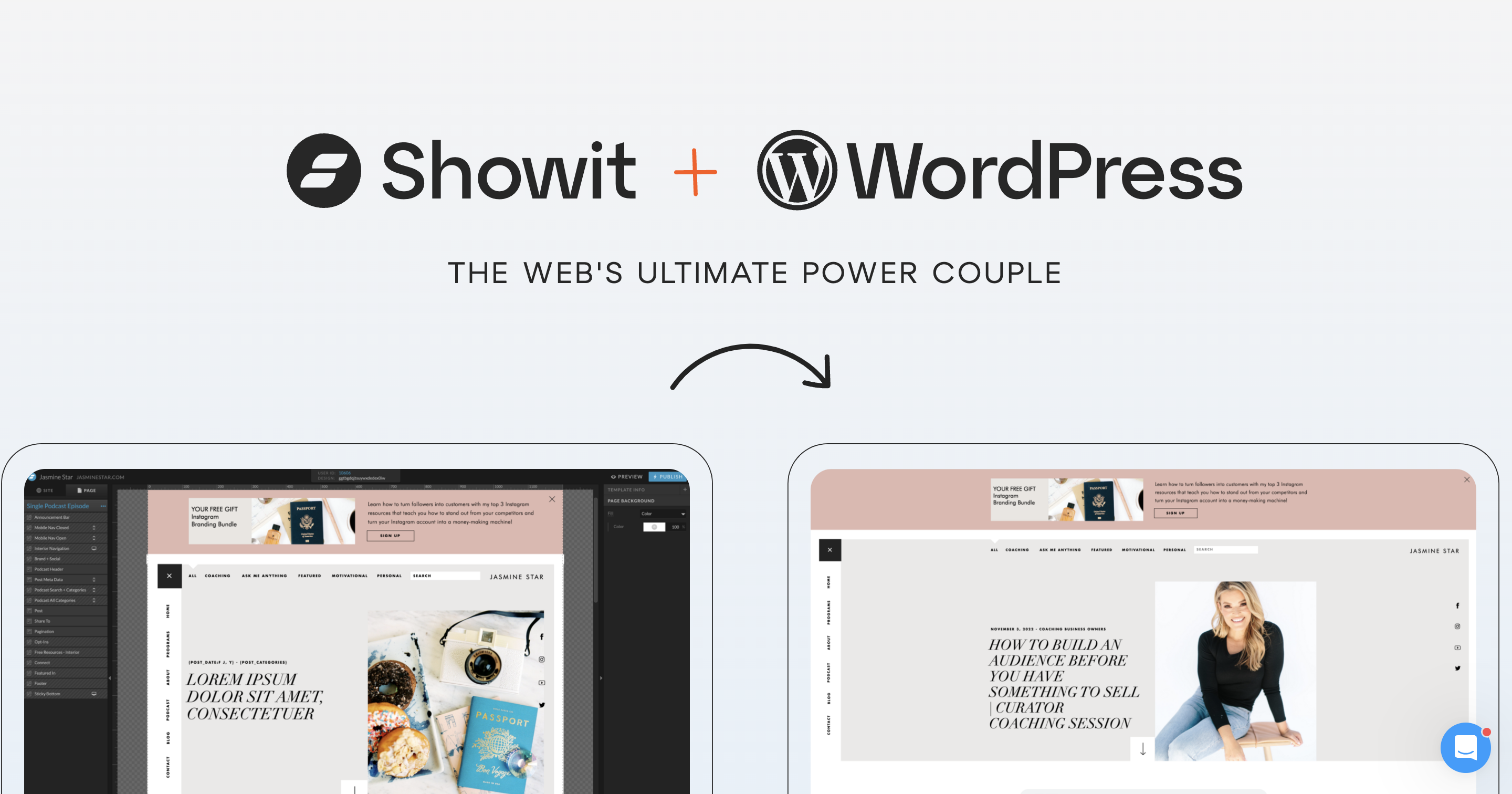 Showit and WordPress logos with the tagline "The Web's Ultimate Power Couple" above two laptop screens showing website designs.